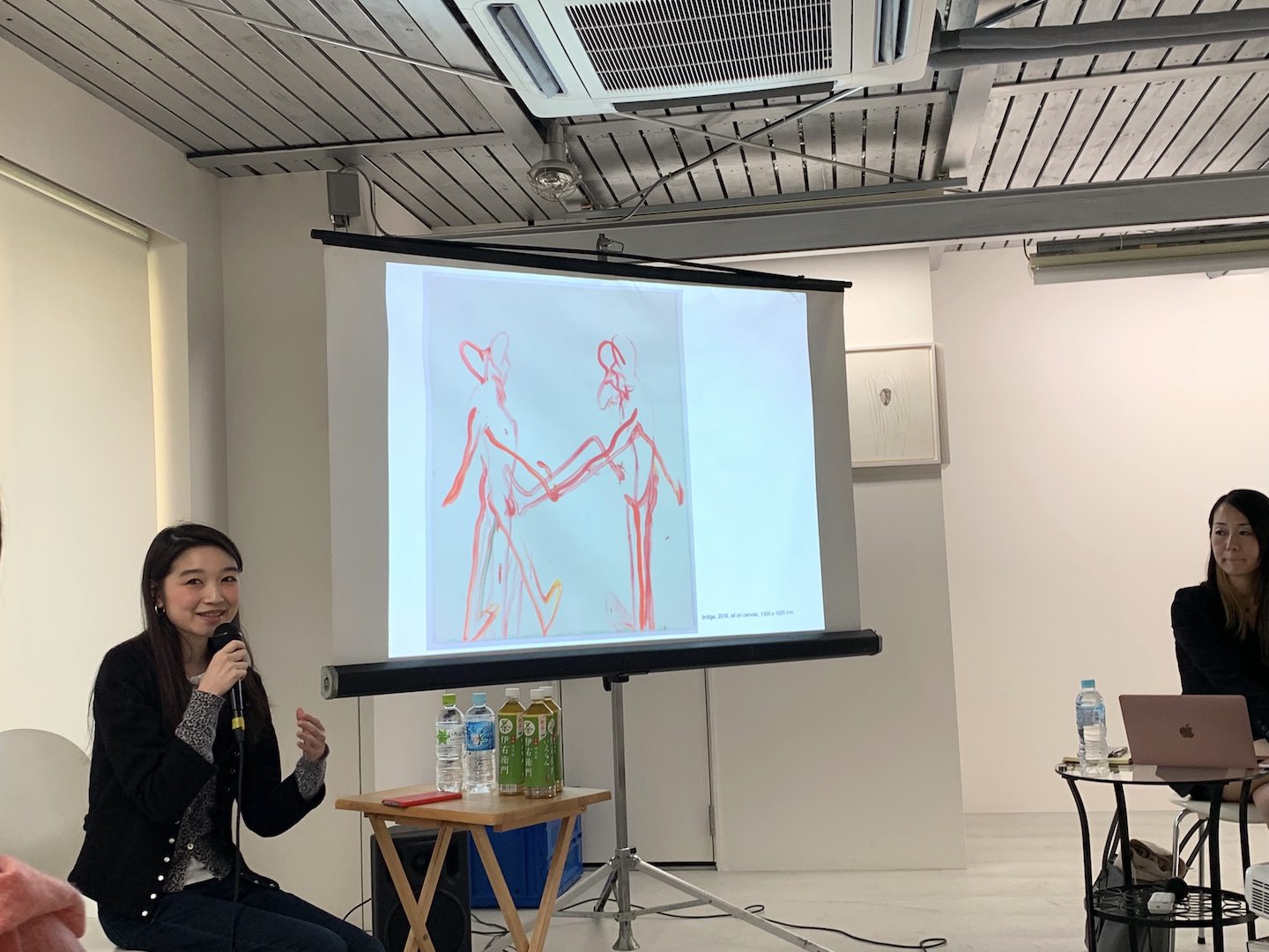 個展開催初日には川内理香子のアーティストトークが開催されました。ナビゲーターは「WAITINGROOM」の芦川朋子さん。2018年に開催されたもうひとつの個展「Tiger Tiger, burning bright」を開催したギャラリーのオーナーさんです。トークショーは過去の作品を振り返りながら川内理香子さんの作品制作に関わる姿勢や考えなどを聞いていく進行です。